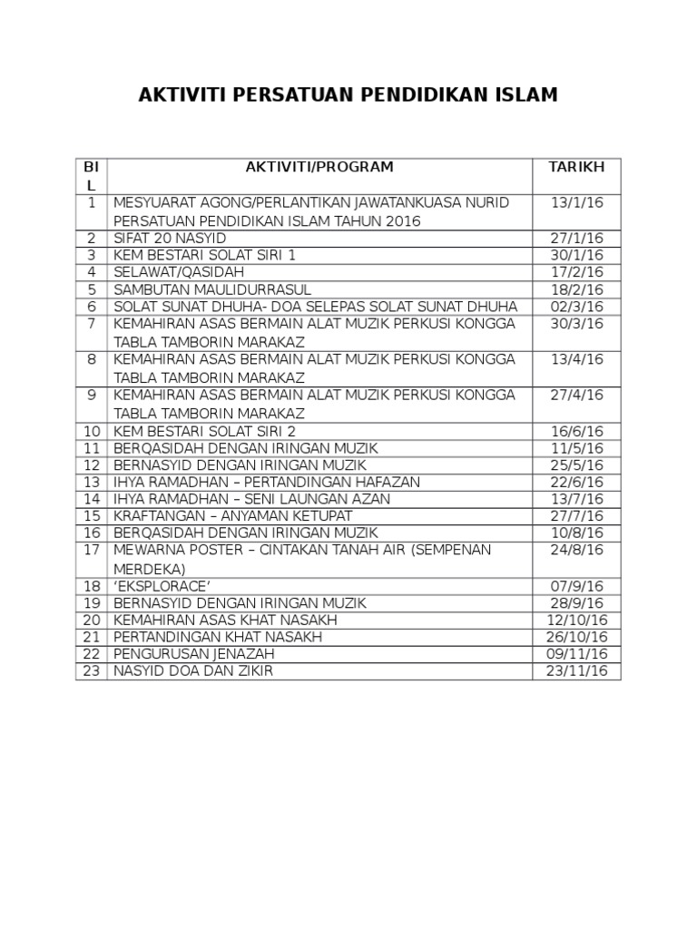 Https Www Moe Gov My En Muat Turun Pekeliling Dan Garis Panduan Kokurikulum Dan Kesenian 1 907 Swasta Jadualpemarkahankelabpersatuanbaru2015 File from Savesave aktiviti persatuan pendidikan islam dan moral skjb. Paparan video aktiviti bpi kpm yang telah diadakan sepanjang bulan september hingga disember 2018 ini telah ditayangkan sempena perhimpunan bulanan bahagian. Nilai islam ditanamkan dalam individu membutuhkan hasil ilmu yang diperolehnya adalah kenikmatan yang besar, yaitu berupa pengetahuan, harga diri, kekuatan dan persatuan. Persatuan pendidikan islam upsi, tanjongmalim, malaysia. Apa itu sains hayat dan sains fizikal apa itu permasalahan kajian apa itu skop projek apartment for rent in klcc apartment for rent in shah alam apartment for sale in kl below 200k apa itu shooting dalam sepak bola apakah impak globalisasi kepada negara kita malaysia. Barisan kepimpinan persatuan pendidikan islam mengucapkan tahniah kepada prof madya dr muhammad rozaimi bin ramle diatas gelaran. Aktiviti persatuan tahun 2010 by khairul adli 31066 views. Abdul aziz b ahmat 3.