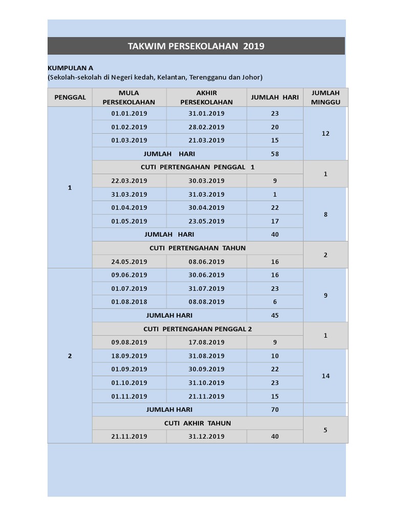 Kementerian pendidikan malaysia telah mengeluarkan takwim pindaan penggal persekolahan tahun 2020 bagi menyusun semula sesi persekolahan bagi tahun 2020 yang terjejas. Penggal persekolahan persekolahan hari minggu. Kerajaan memahami dan mengambil berat akan keperluan. Perlis, pulau pinang, perak, selangor, negeri sembilan, melaka, pahang, sabah, sarawak, wilayah persekutuan kuala lumpur. Kementerian pendidikan malaysia (kpm) melalui portal rasminya telah mengeluarkan takwim persekolahan tahun 2019 sebagai rujukan dan panduan pihak yang terlibat terutama guru dan juga murid. Takwim penggal persekolahan 2019 ini mengandungi 2 kumpulan mengikut hari kelepasan mingguan negeri iaitu kumpulan a dan b. Mulai hari ini, kamis (12/12/2019), hasil seleksi jadwal terbaru tahapan cpns 2019 telah dirilis oleh bkn. Para pelamar cpns 2019 kini bisa memastikan pada tanggal berapa per tahapan dimulai dan. Jumlah hari persekolahan termasuk cuti am. Mereka yang melamar pada cpns 2019 langsung mengecek jumlah saingan pada formasi yang dituju. Kpm menyatakan jumlah hari persekolahan secara bersemuka berdasarkan pindaan takwim penggal persekolahan 2020 adalah 168 hari bagi bilangan hari pembelajaran di rumah hanya terpakai kepada murid tingkatan lima dan enam manakala bagi murid lain bergantung kepada bila. Posted by tok sheikh at 5:07 pm. Kpm telah menyediakan perancangan jadual persekolahan di seluruh negara setiap tahun termasuk pada tahun hadapan.